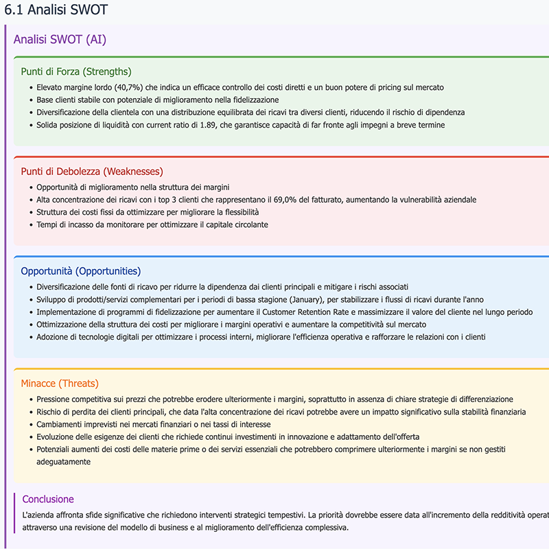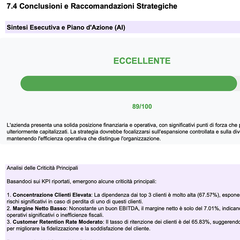 NEITCUS® è una piattaforma di Business Intelligence che legge i dati del tuo giornale contabile e li trasforma in una Analisi Finanziaria prodotta da AI Generativa OpenAI senza esigere competenze tecniche o finanziarie.