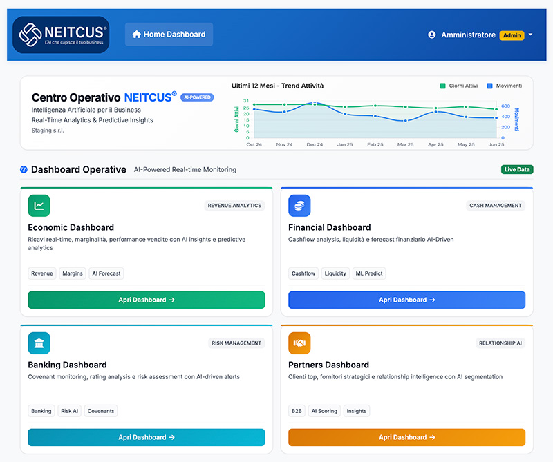 NEITCUS® si aggancia al tuo gestionale fornendo una Analisi Finanziaria AI-Driven chiara e comprensibile a chiunque leggendo i dati dal libro giornale del tuo software gestionale.